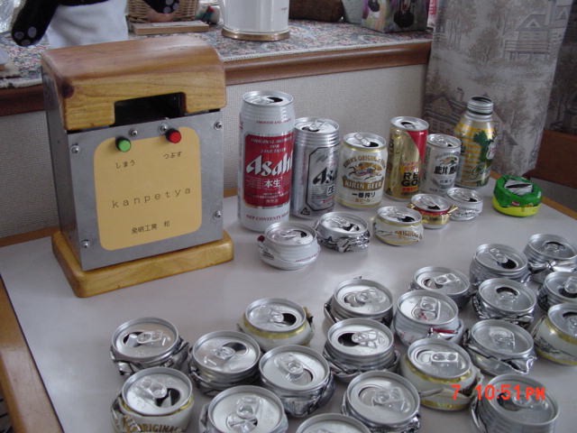 かんぺちゃの隣が潰す前と後の500、350、250、190,135mlの缶と300mlのボトル缶です。手前は350ml缶です。