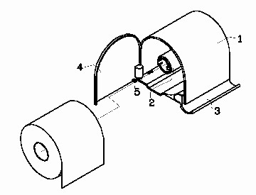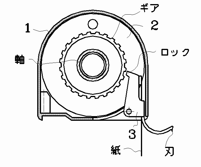 ホルダー本体1の中心に回転軸があり、その軸に図のようなギアが付いた回転盤2があり、トイレットペーパーが圧入されています。その右側にはロックが付いたカッター3があり、これにトイレットペーパーを押し付けて切断する力でギアがロックされ、スムーズに切断できます。