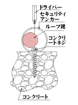 セキュリティーアンカーは、ループ鍵を通してないとき には、コンクリートネジを緩めて取りはずし、取付けが 自由に出来ますが、一旦ループ鍵を通したら、ループ鍵