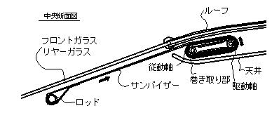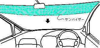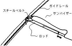 上図は電動サンバイザーの装着図で、ピラーに 取り付けた、ガイドレールに沿って下降する。